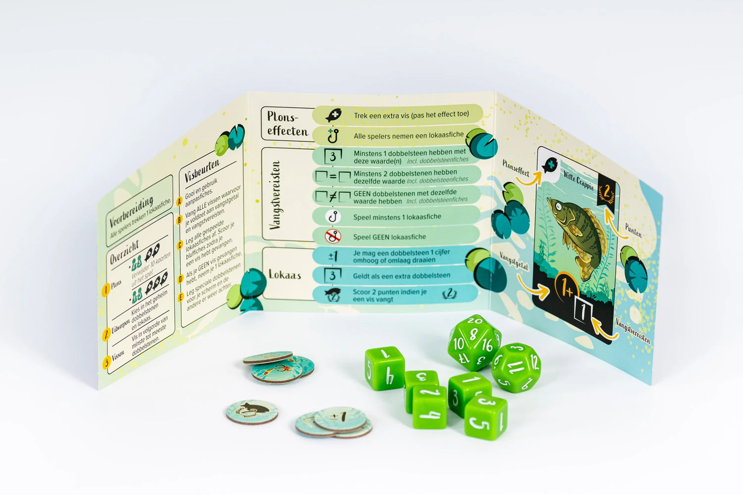 Speel je risicovol om vroeg aan de beurt te zijn, of wacht je geduldig op de grote vangst? Vergeet niet je speciale dobbelstenen en lokaasfiches te gebruiken. Wie de meeste punten scoort (van gevangen vissen), wint!