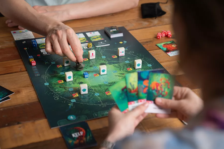 Terwijl spelers de rol van deze iconische zeedieren op zich nemen, zullen ze ontdekken dat de spelmechanismen nauw aansluiten bij hun echte tegenhangers. Elk dier heeft een unieke weg naar de overwinning. De octopus, bekend om zijn sluwheid en aanpassingsvermogen, sluipt rond op het bord door kaarten te spelen en zijn verborgen en onthulde blokken te beheren, waarbij hij gebruikmaakt van het opmerkelijke vermogen van het dier om zich te camoufleren en te misleiden. Aan de andere kant patrouilleert de haai, die het meedogenloze en vastberaden roofdier belichaamt, in zijn territorium en probeert hij de ongrijpbare octopus te vangen door te dobbelen en speciale vaardigheden te gebruiken om hun geluk te verminderen, waarmee hij het natuurlijke instinct en roofzuchtige gedrag van het wezen laat zien. Het spel is een spannende mix van deckbuilding en dice bag building, maar ook verstoppertje spelen, bluffen en manipulatie.